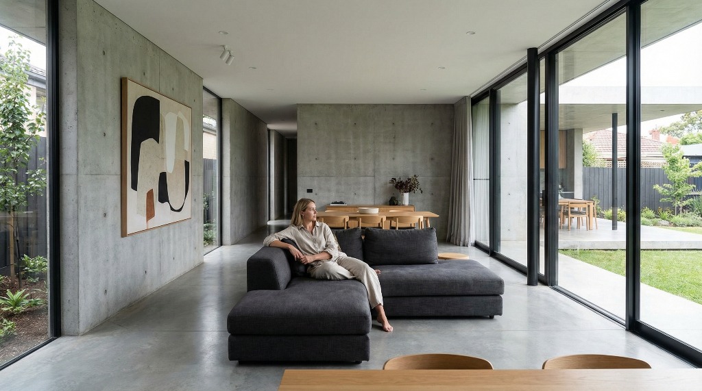 A woman relaxes on a sofa in a modern, minimalist living room with large windows and concrete walls.